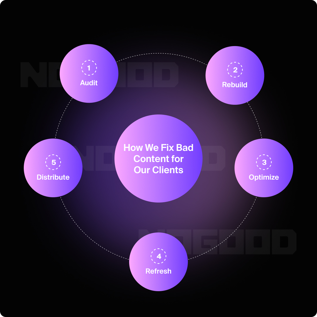 Spotting bad content is only half the battle; fixing it is where the real work (and growth) happens. At NoGood, our content marketing process isn’t about quick hacks or patch jobs. We take a structured, repeatable approach that transforms underperforming content into long-term growth assets (it’s how we get a lot of our clients, too!).